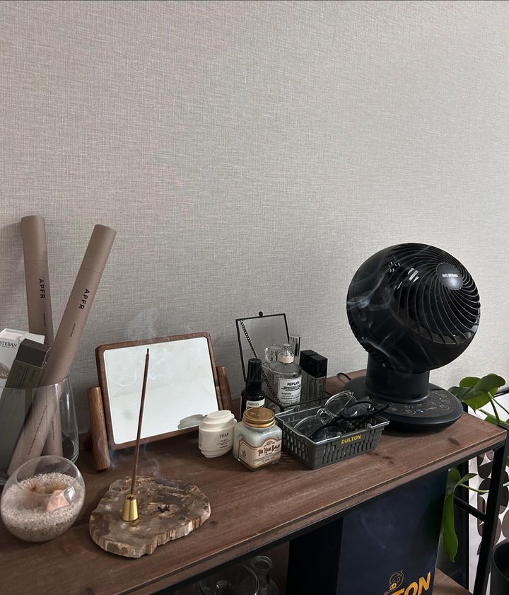 上にはお香やアクセサリーなどお気に入りのものを並べて、気分の上がるコーナーになっていました。