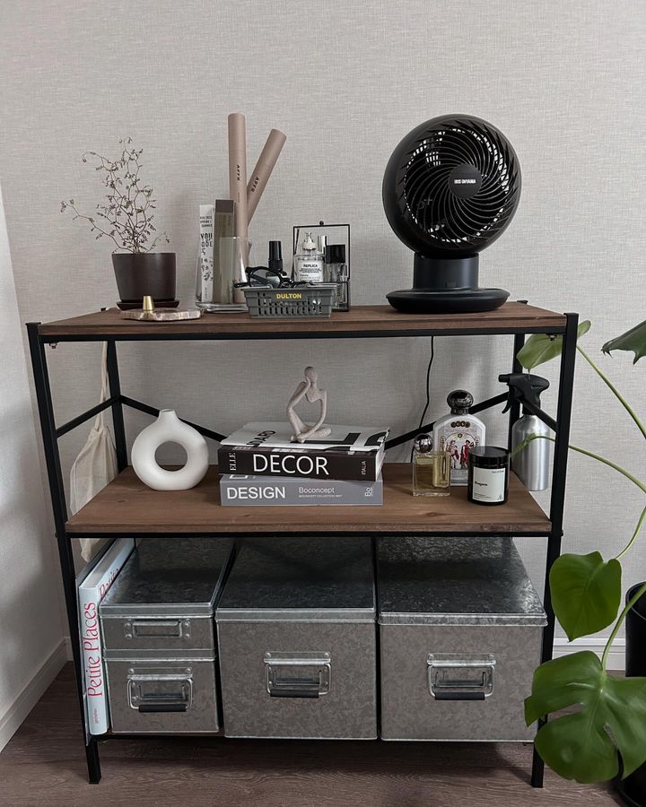 雑貨屋さんでお手頃価格で購入されたという、お気に入りのシェルフ。「アイアン家具が好きで、かわいいなと思って購入しました。部屋に収納が多くないので、下の段には無印良品のトタンボックスを置いて、書類や小物を入れています。使い勝手がよく、前に住んでいた部屋からずっと使っています」