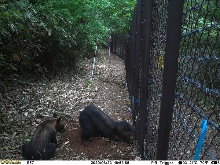2020年に園内に入ってきたヒグマの親子が外に出ようとしている様子。滝野すずらん丘陵公園ではその後クマ対策を強化していて、侵入ゼロを維持しています