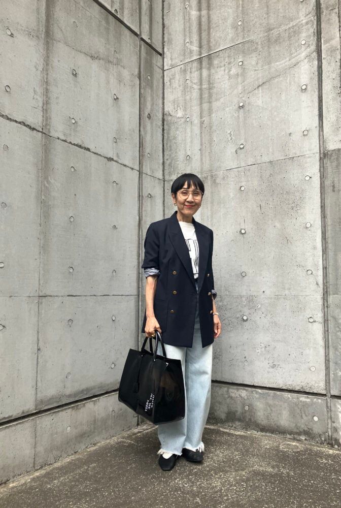 「『JOUNAL STANDARD』の紺のブレザーを主役に、『WhimGazzte』のTシャツとコクーンデニムパンツを合わせて程よくカジュアルに。診断でイエベと知りましたが、普段からそこにとらわれすぎずに”着てみたい!””素敵!”と思えるものにチャレンジしています」