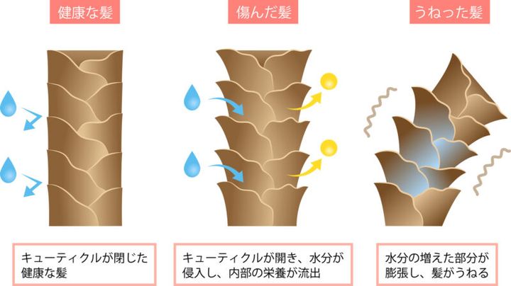 健康な髪はキューティクルが閉じた状態ですが、傷んだ髪はキューティクルがはがれたり開いたりした状態に。すると、湿気の影響で水分を含んで膨張する部分と、水分を含まない部分が入り乱れ、髪の広がりやうねりが起こります。