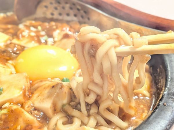 よくある激辛系ではなく、甘みとコクのある麻婆餡が特徴で、豆腐も麺も餡をたっぷりまとっていて、麺を持ち上げると「重っ」と思うほどしっかり麺に餡が絡んでいます。