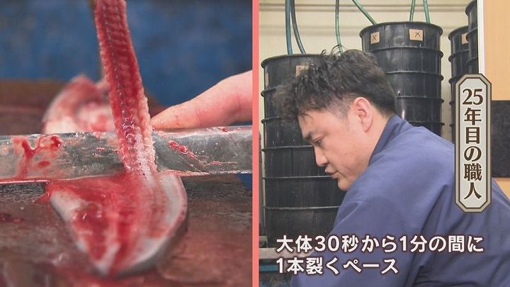 職人:「大体30秒から1分の間に一本裂くペース。少なくても150匹~200匹の間でやります」