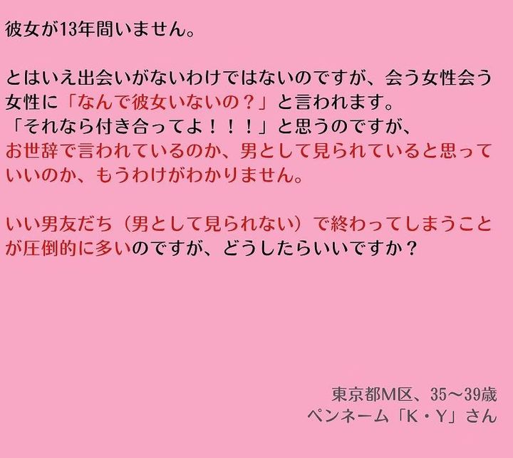 「良い男友だち(男として見られない)で終わってしまう」という、K. Yさんの告白。