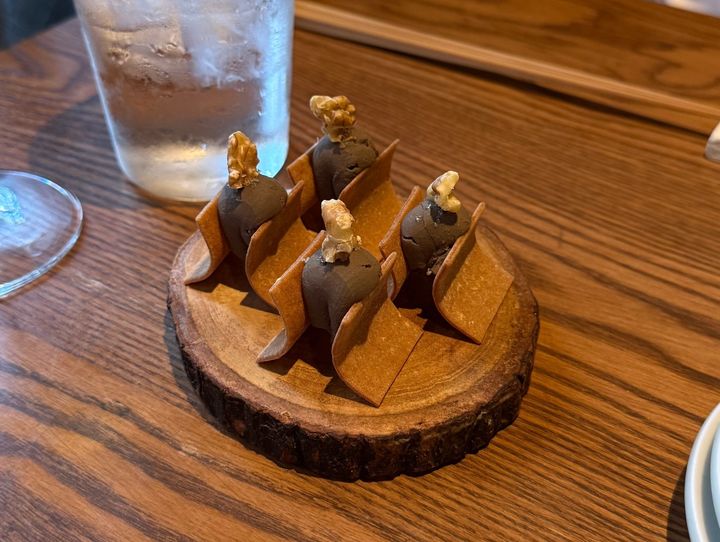 京鴨のレバーペーストを八ツ橋で挟んだ前菜!!これを食べたくてずっとブックマークしていました。笑
