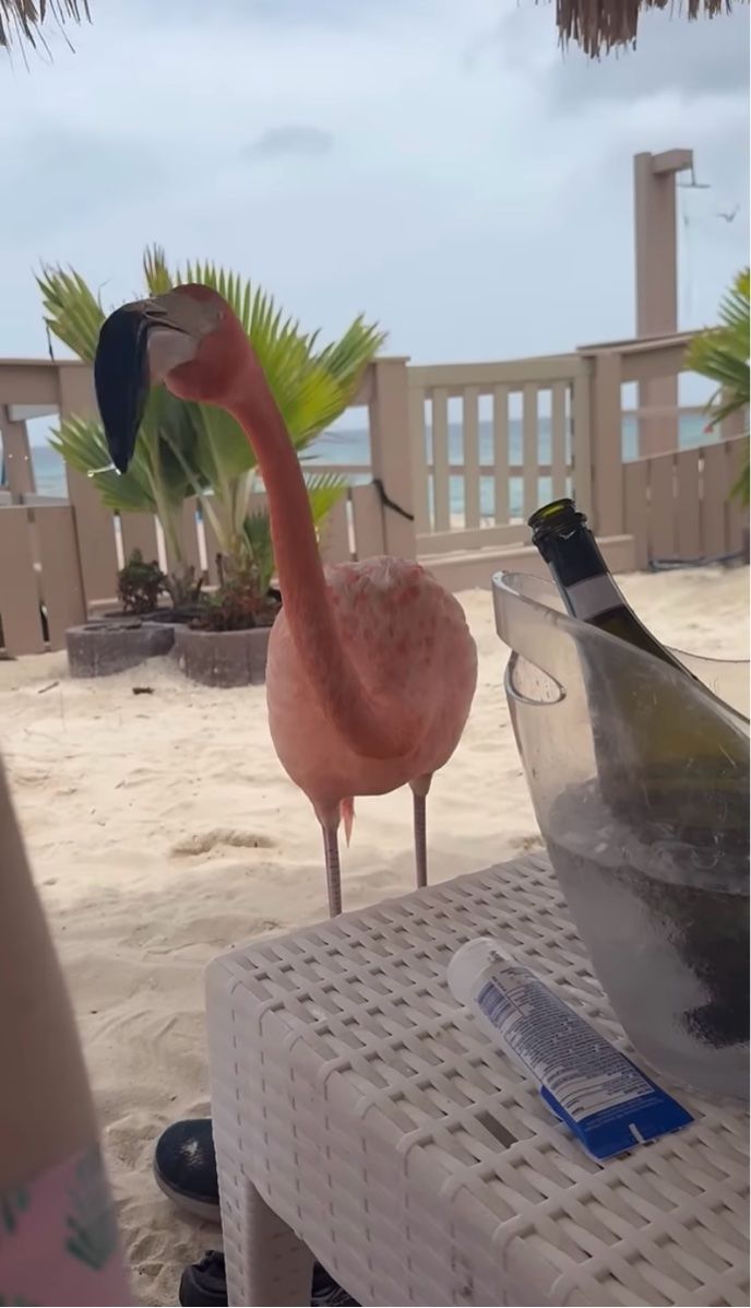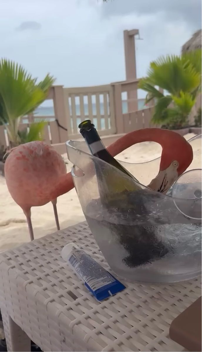 3. フラミンゴもバカンス気分?アイスペールの氷水を飲んだりひと心地ついてみせたり・・【海外・動画】
