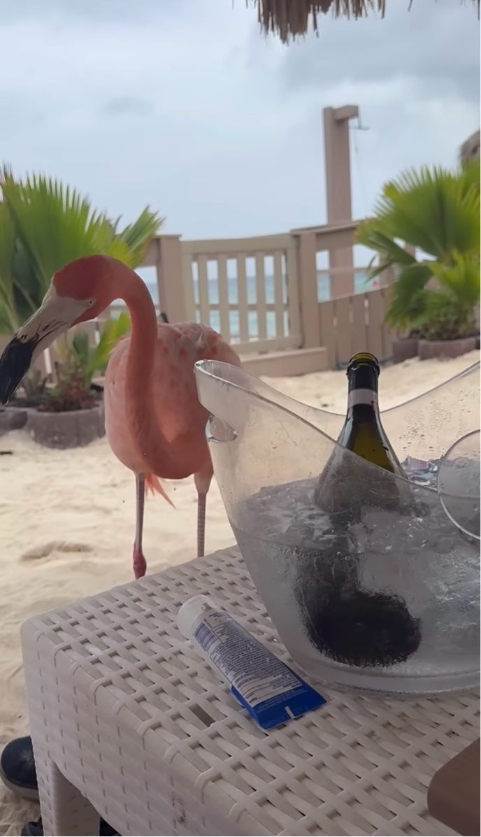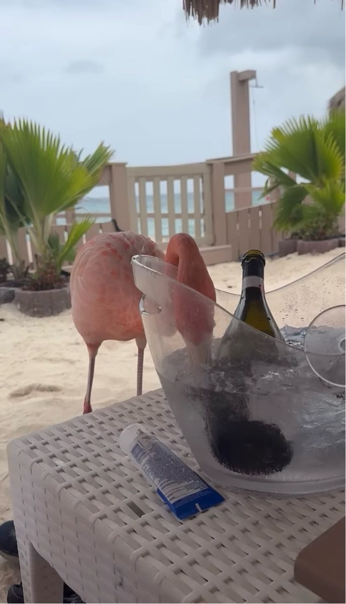 すると、そこへ現れたのは1羽のフラミンゴ。 このフラミンゴは、テーブルの上に置いてあったドリンクの保冷用のアイスペールに、長いクチバシを突っ込んで氷水を飲み始めたのです。