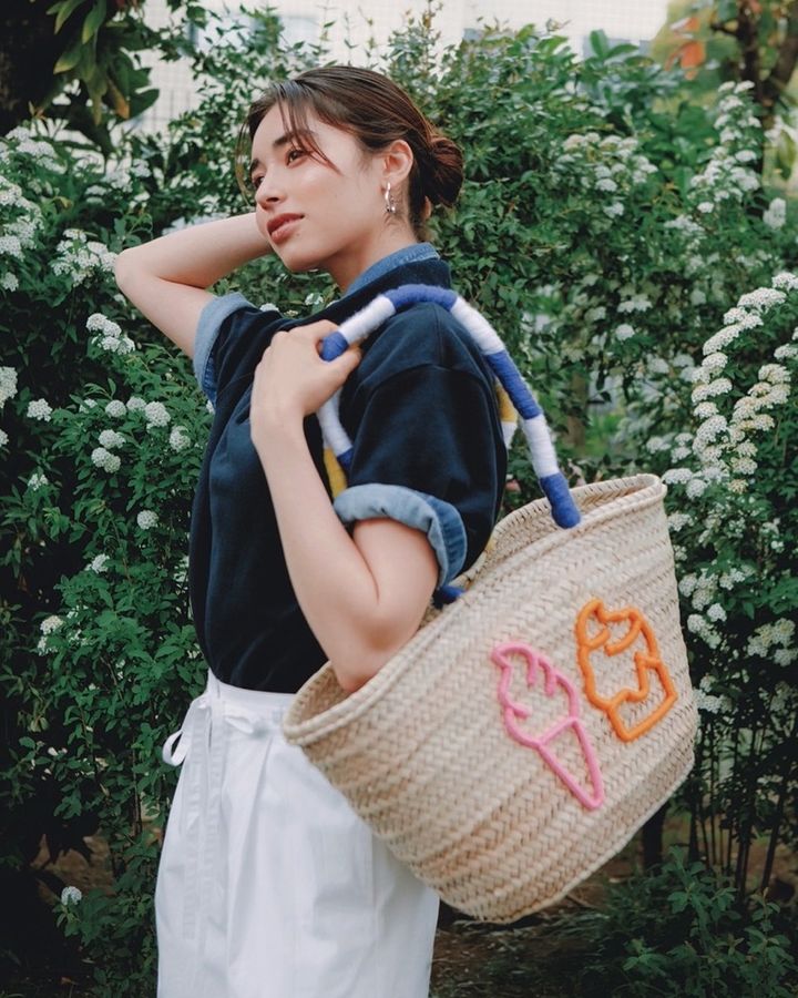 7月25日(金)、シャツをラフにロールアップして、白ボトムと合わせた爽やか配色。そこに夏らしい刺繍と色使いが楽しい、アイスクリームモチーフのかごバッグをプラス。カラフルなハンドルが遊び心たっぷりで、ユーモアの効いた小物使いが大人の余裕を感じさせて。