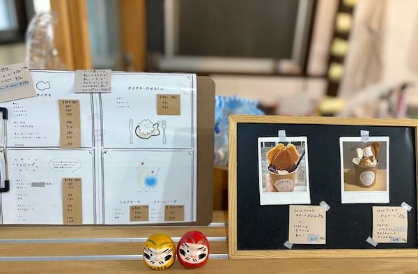メニューはタイヤキをはじめ、クリームソーダやミルクセーキなどのドリンク、そしてかき氷やぜんざいもあります。 タイヤキはあんこやスイートポテトなど甘い味のほかに、ハム&チーズやめんたいチーズなど、おかず系のものも。
