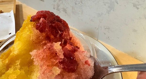 口に入れると、ゴロッとした果実とともにふわふわ氷がほわっと溶けていきます。シロップはなるほど、いちごの酸味も感じられるよう引き立て役になっていて、まるで冷たい果物を食べているようです。マンゴーもピューレ状でないので甘すぎず、マンゴー自体の美味しさが味わえて、氷と一緒に乾いた喉を潤してくれます。 『ハム&チーズ』のタイヤキと交互に食べると、トロッと溶けたチーズのしょっぱさと、かき氷の甘みをいい感じに味わえて幸せです。