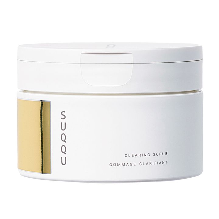 「角質が残っているとザラつきやくすみを感じるので、朝のスクラブ洗顔で優しく取り去ります。次のスキンケアが浸透しやすくなるのを実感」100g¥4,950(SUQQU)