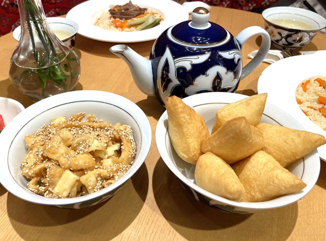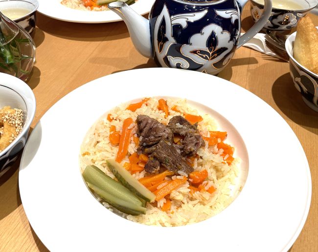 トルクメニスタンでは、スパイスなどはあまり使わず素朴な味わいの肉料理がポピュラーなんだそう。こちらではお茶やコーヒーにペストリーといったカフェメニューがメインですが、ごはん系メニューもありました。ちなみに料理は、すべて現地の人が腕を振るう本場の味!