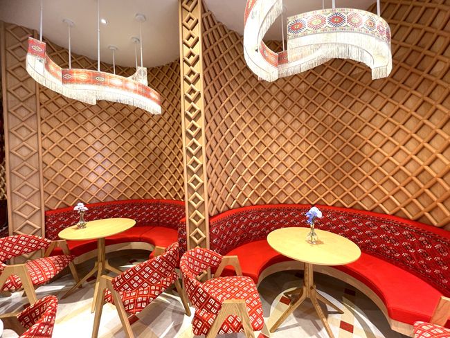 目を引く外観と、あふれる異国情緒に人気上昇中のトルクメニスタン館。パビリオンの3階、美しい民族衣装が飾られた廊下の奥に、レストラン・カフェがあります。入口には、現地の家の部屋を再現したスペースがあり、トルクメニスタン製の絨毯や装飾で彩られ、窓の外には国旗がはためく…。もちろんスタッフ同士の会話も現地の言葉で、海外旅行気分が一気に高まります!