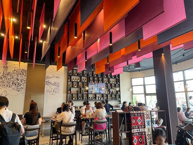 カフェスペースやバーカウンターがオシャレなセルビア館のレストラン。鮮やかな色合いのファブリックや、壁に描かれたデザイン画、入り口にある子どもの像など、全体的にアーティスティックな雰囲気です。