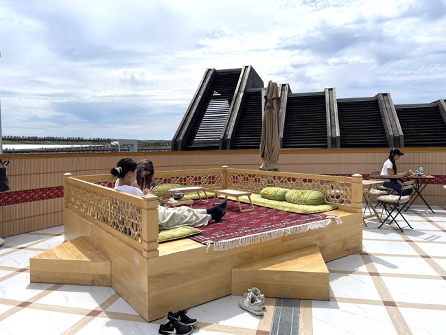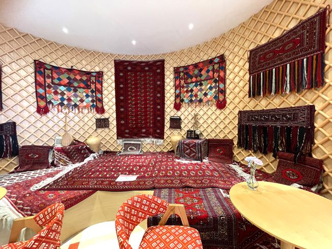 独特の丸みを帯びたレストランは、遊牧民の移動式テントをイメージしています。伝統的な幾何学模様があしらわれたファブリック類は、すべて現地から持ち込んだそうです。観光ではなかなか訪れるのが難しい国のひとつであるトルクメニスタンですが、その雰囲気をしっかり味わえますよ。
