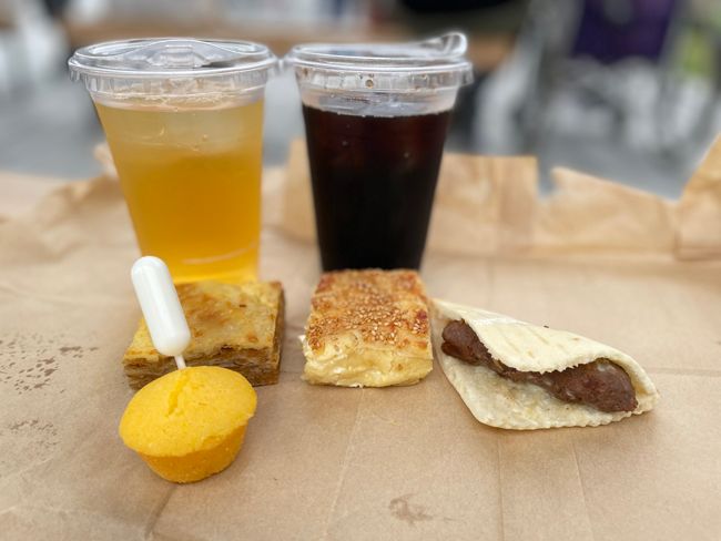こちらのカフェでは、このほかポンデボーノ(コロンビアのチーズのパン)やバスクチーズケーキなどのフードもスタンバイしているので、小腹が空いたときも使えますね。ちなみに、同じお店ですがドリンクとフードは並ぶ列が違うので、確認してから並んでくださいね。