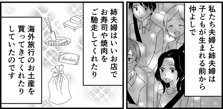 私たち夫婦と姉夫婦は子どもが生まれる前から仲がよく、時間が合えば4人で外食していました。そして姉夫婦は毎回いいお店でご馳走してくれたり、海外旅行のお土産を買ってきてくれたりしていたのです。