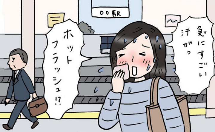 そして、肩凝りや頭痛がなんとなく治まった11月の寒い夜。推しのライブの帰り、乗り換えのため電車を待つ間のホームで急に汗が吹き出し、全然止まらず自分でもビックリ! 「これはちょっとおかしい。これがうわさに聞くホットフラッシュ?」と更年期を疑い始めました