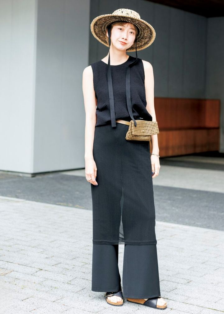 「スカートとパンツを重ねたボトムレイヤードでワントーンコーデを今年っぽく。夏になると頼りがちな黒のワントーンも、肌見せや異素材の組み合わせによって抜け感を出すように意識しました」