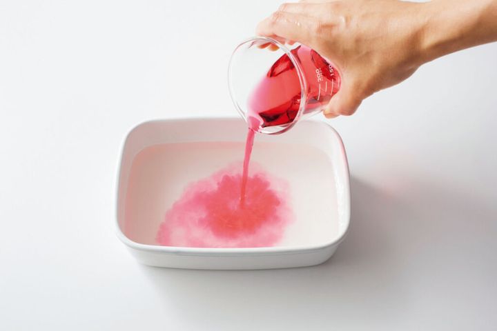 (1) バットに砂糖、レモン汁を入れてスプーンでよく混ぜ、砂糖を溶かす。水1カップ、かき氷シロップ(写真はいちご)を加えて混ぜる。