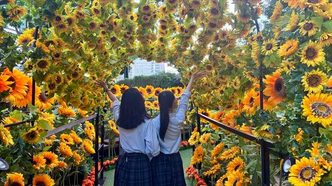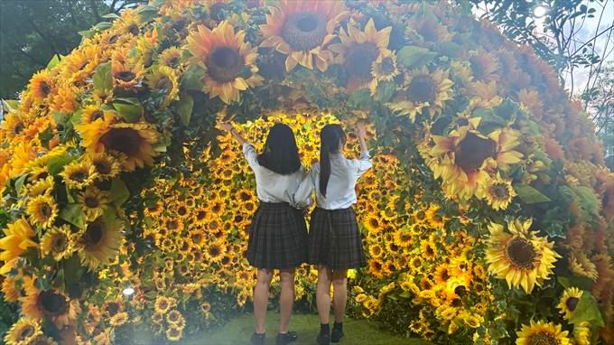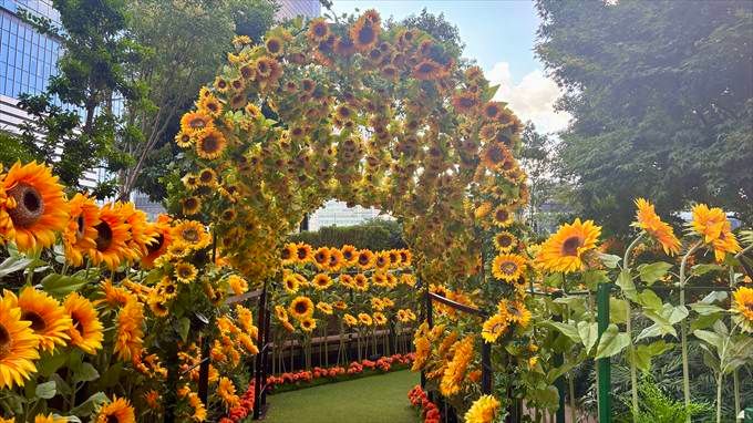 「ひまわりトンネル」の色鮮やかなひまわりに囲まれて歩くひとときは、まるで絵本の中の庭園に迷い込んだような気分に。