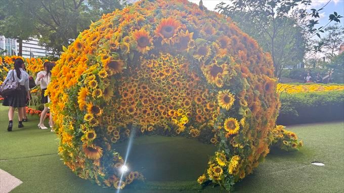 「ひまわりスカイガーデン2025」で大注目フォトスポットは、360度ひまわりに囲まれた「ひまわりドーム」です。外から眺めるだけでなく、実際にドームの中に入れるのが魅力。まるでひまわりに包み込まれるような没入感たっぷりの空間が広がっています。