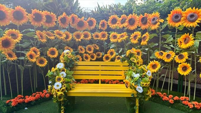 ひまわりで華やかに装飾された黄色い「ひまわりベンチ」は、撮影待ちの列ができるほどの人気ぶり!ベンチの周囲にも無数のひまわりが咲き誇り、座るだけで明るく夏らしい写真が撮れる素敵な場所です。