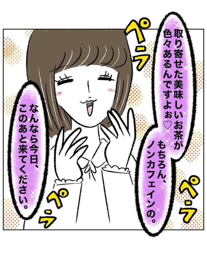 すると、ゆかちゃんママは突然笑顔になり「取り寄せた美味しいお茶が色々あるんですよぉ。もちろん、ノンカフェインの。なんなら今日、このあと来てください」と、一方的にペラペラと話し始めました。