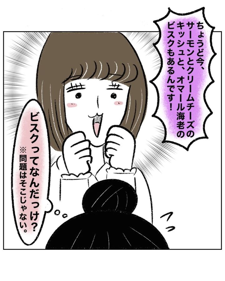 「ちょうど今、サーモンとクリームチーズのキッシュと、オマール海老のビスクもあるんです!」とまるさんが来る前提でウキウキと話すゆかちゃんママの話しをぼんやり聞きながら「ビスクってなんだっけ?」とどうでもいいことを考えていたまるさん。