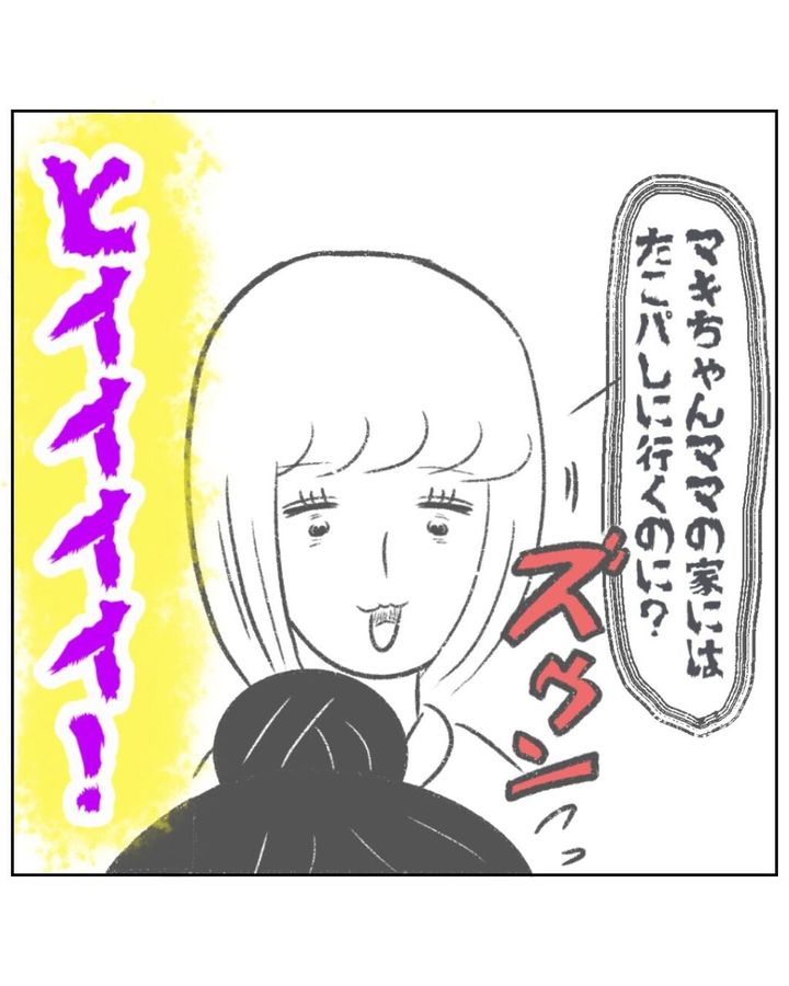 ゆかちゃんママから絵本のお返しをしたいから家に遊びに来てと誘われたまるさんが「お返しとか本当にいいので!行きません!」ときっぱり断ると、さっきまるさん達がたこやきパーティーの話しをしていたのを聞いていたゆかちゃんママが「マキちゃんママの家にはたこパしに行くのに?」と詰め寄ってきました。