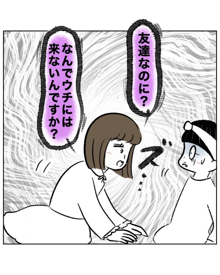 「友達なのに?なんでウチには来ないんですか?」とゆかちゃんママにじりじりと迫られ、まるさんは恐怖を覚えます。