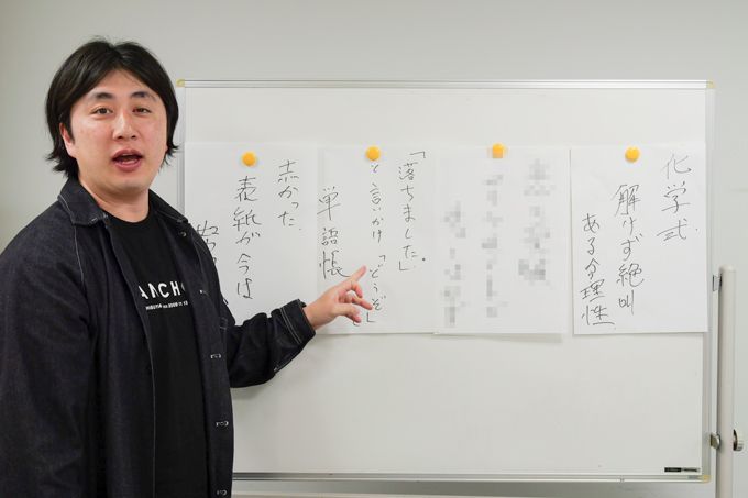 寺内:電車に乗っていると、たまに単語帳を血眼になって読んでいる子がいますよね? 中には電車の中で単語帳をポトンと落として、降りちゃう子もいるでしょう。そういった時に僕はどうするのか。【落ちました と言いかけどうぞ 単語帳】。