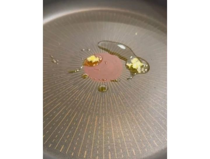 フライパンを熱しオリーブオイルを入れて温めたら、ニンニクすりおろしを入れて香りを出します。