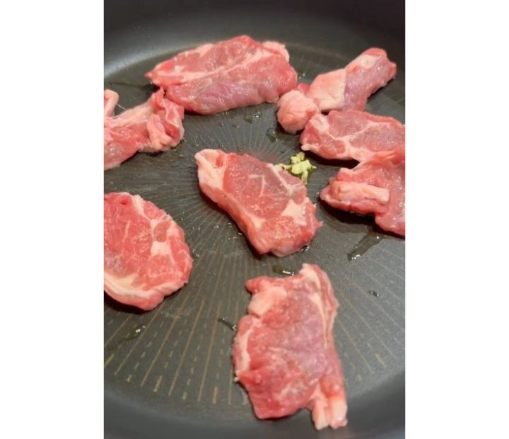 にんにくの香りが出てきたらラム肉をフライパンに並べ、上から塩をひとつまみかけて下味をつけます。