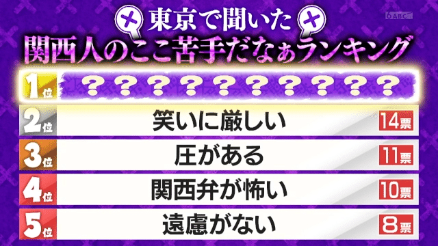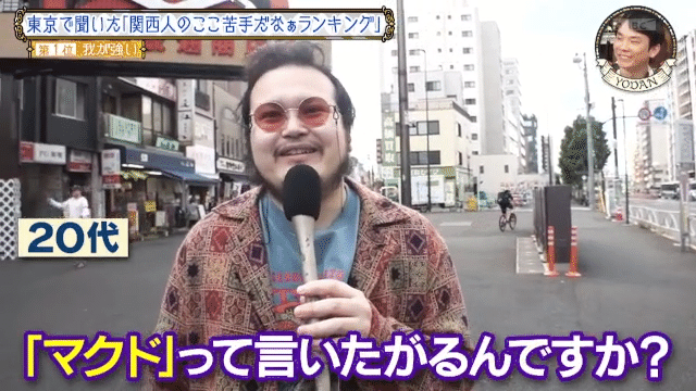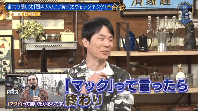 東京で余談調査した「関西人のここ苦手だなぁランキング」で「我が強い」が1位に。街頭インタビューに答えた男性が「何でマクドって言いたがるんですか?」と関西人の特徴を指摘すると、濱家は「自分でも気づいてなかったけど、あるわって思いました。マックって言ったら終わりと思っているんです」と関西人としての自負を明かした。