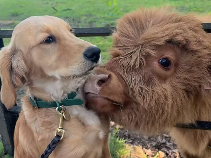 「友達になれるかなぁ?」 犬さんにグイグイ迫る子ウシさん!