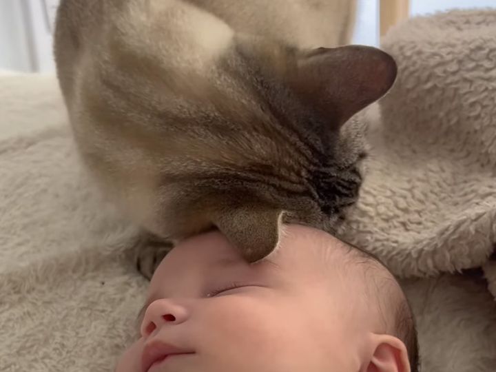 赤ちゃんをそっと見守る猫さん 愛情を伝えるしぐさが尊すぎると大反響