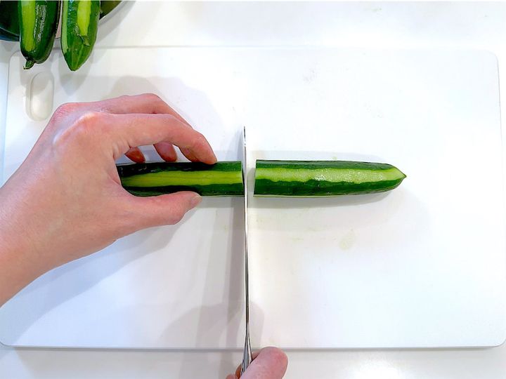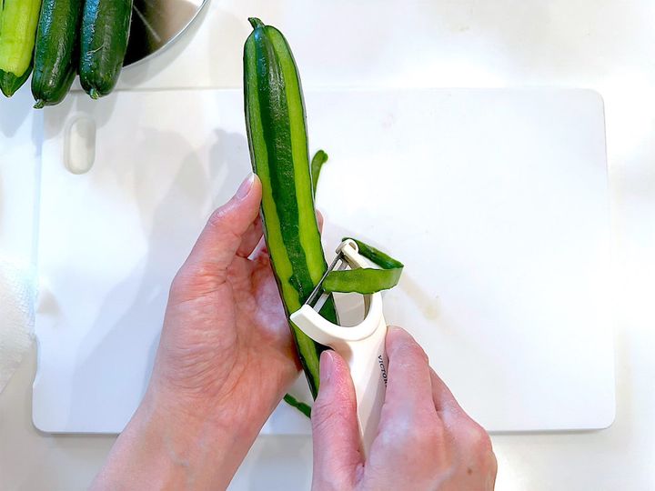 2. きゅうりはピーラーで縞目に皮を剥き、半分の長さに切る。