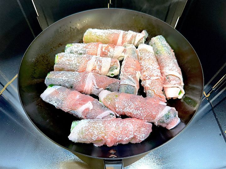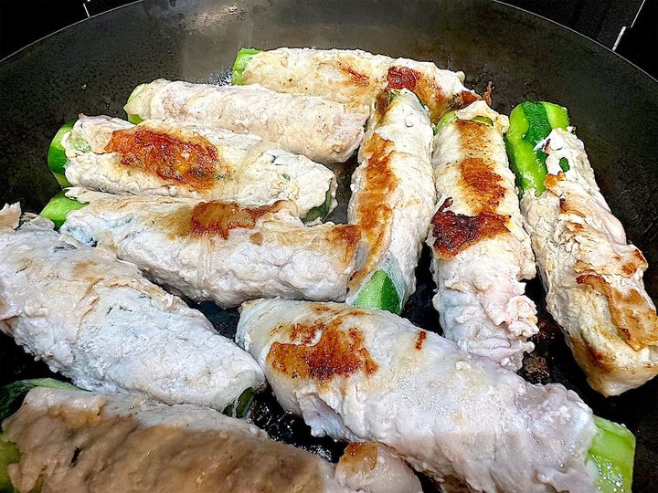 5. フライパンにこめ油を引き、豚肉の巻き終わりを下にして並べる。