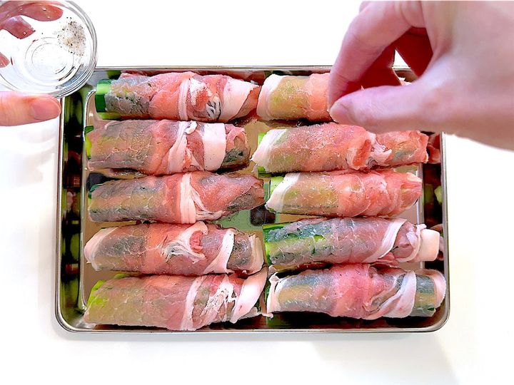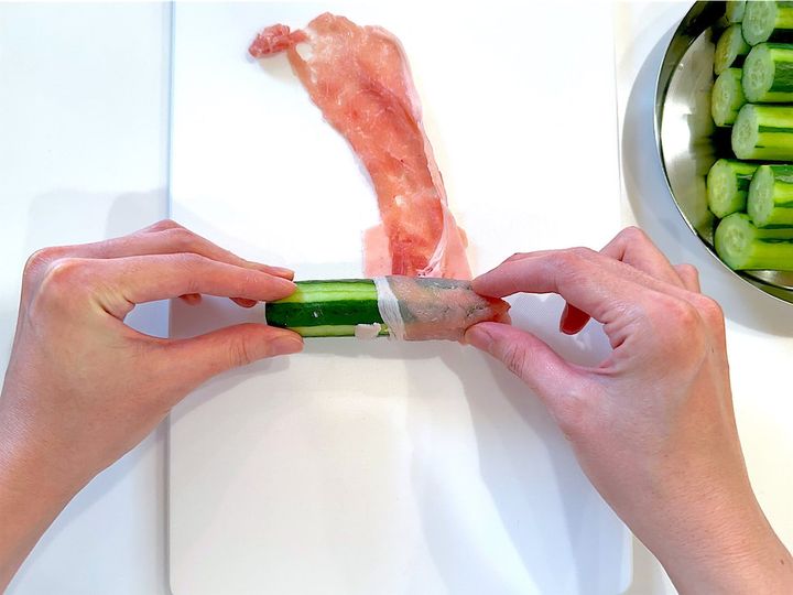 3. 豚肉を縦に広げ、その上にきゅうりを置く。きゅうりの表面を覆うように豚肉をらせん状に巻く。巻き終わりを下にして、置いておきましょう。