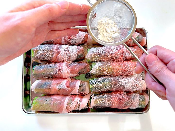 4. 10本巻き終わったら塩、こしょうをして、薄力粉を全体にまぶす。