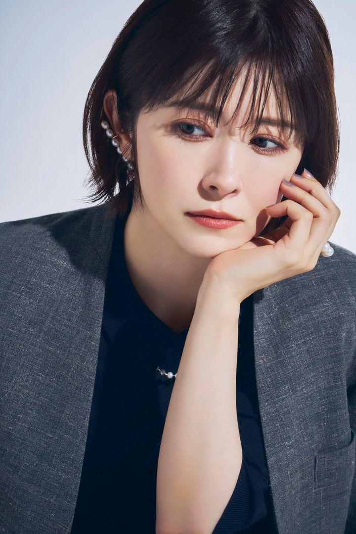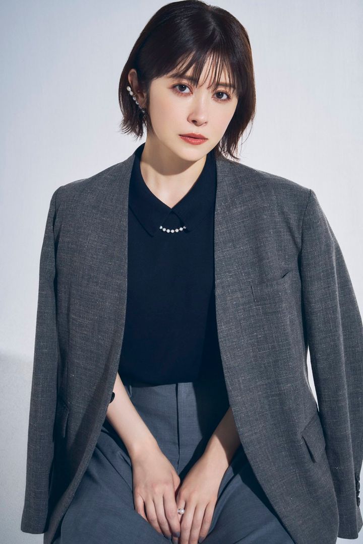 宮澤さん●ジャケット¥110,000(YLEVE)、ニット¥40,700、スカート¥44,000(共にJOHN SMEDLEY/Lea mills agency)、リング¥49,500、イヤカフ¥29,700(共にcarat a/ISETAN SALONE TOKYO)、ネックレスはスタイリスト私物