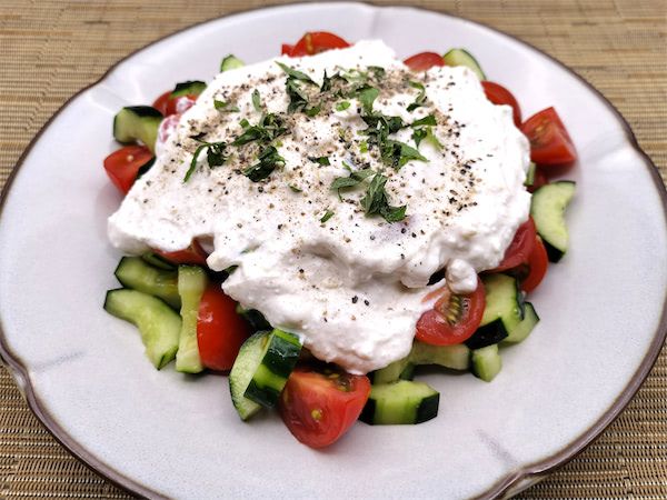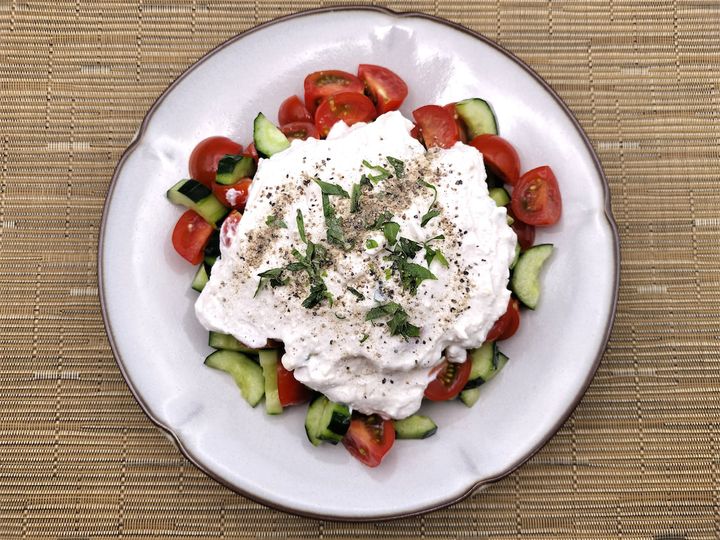 トマトの赤、ヨーグルトの白、きゅうりの緑ときたらイタリアの三色旗ですが、とても目にやさしいサラダが出来上がりました。ヨーグルトを絡めながら口へ運ぶと、トマトのやわらかい食感ときゅうりのシャキっとした食感の対比が気持ちよく、ヨーグルトとレモンの酸味がそれをまとめるように包み込んでいました。