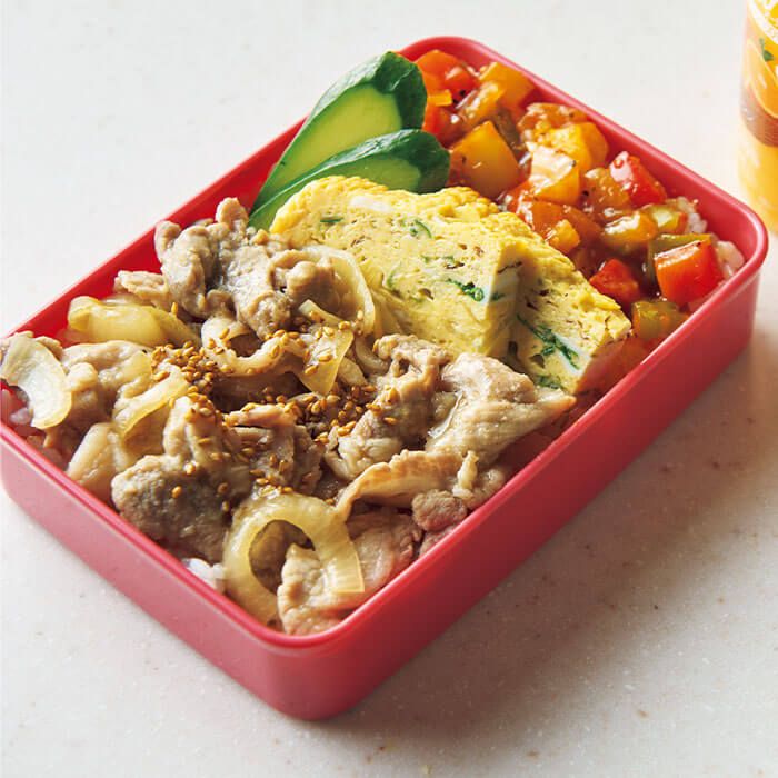 ③弁当箱にご飯を詰めて①と②、好みで卵焼き、カットきゅうりを盛りつけ、しょうが焼きに白ごまをふる。
