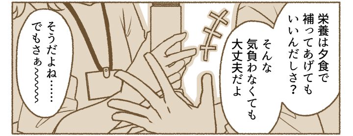 「しっかり栄養を摂らせないと!」と躍起になるのではなく、「お腹が満たされればいいか」くらいの軽い気持ちでいいのかもしれません。栄養面での調整は、朝や夜の食事ですればいいのです。