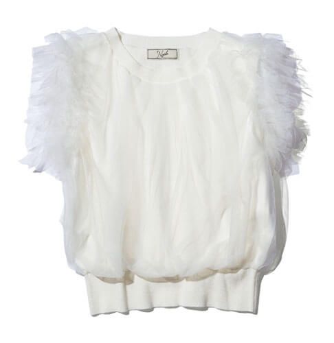 ふわふわのチュールフリルで可愛く目隠し♡ ニット全体にチュールを重ね、袖口はボリュームたっぷりのフリル状に。二の腕が見える面積をさりげなく減らせるので、ノースリ姿に自信が♪