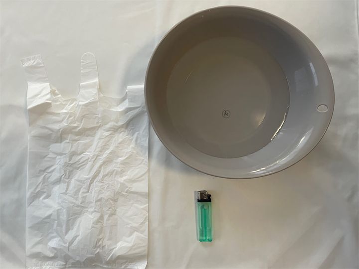 用意したのは、水、ビニール袋(今回は100均やスーパーによく売っている取っ手付きのもの)、ライター。