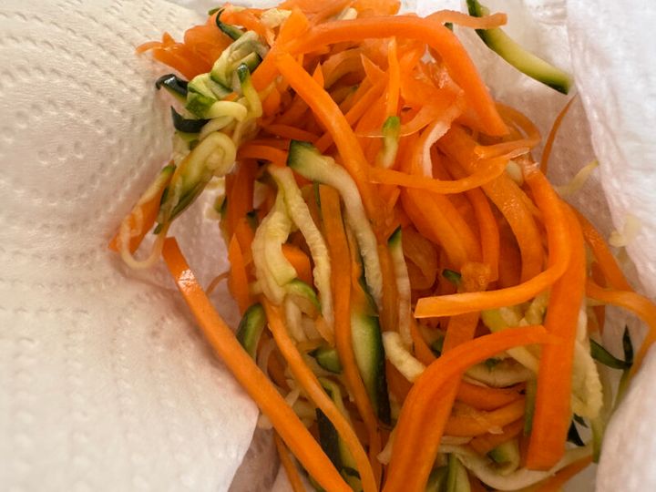 ①にんじんとズッキーニは千切りにし、塩(分量外)をふりかけ揉み込み5分ほど置く。