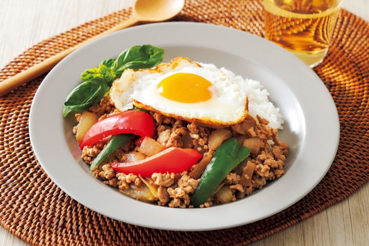 夏野菜の茄子、ビタミンB群や鉄分が豊富な豚肉でつくるガパオライスは、家族みんなが大好きな1品。