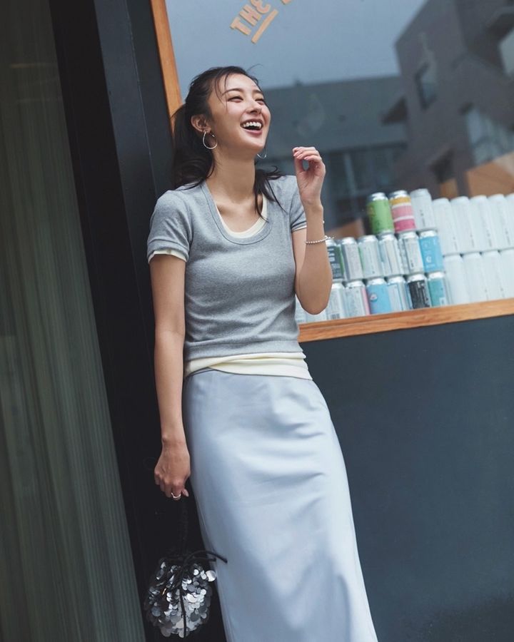 7月26日(土)、鎖骨がきれいに見えるコンパクトなTシャツは、ヘルシーな肌見せが叶う夏の味方!丈の異なるイエローのインナーを重ねて、首元と裾にアクセントをプラス。スパンコールの巾着バッグで、シンプルな着こなしに華やぎを添えて、華奢アクセで大人の女性らしさも忘れずに。